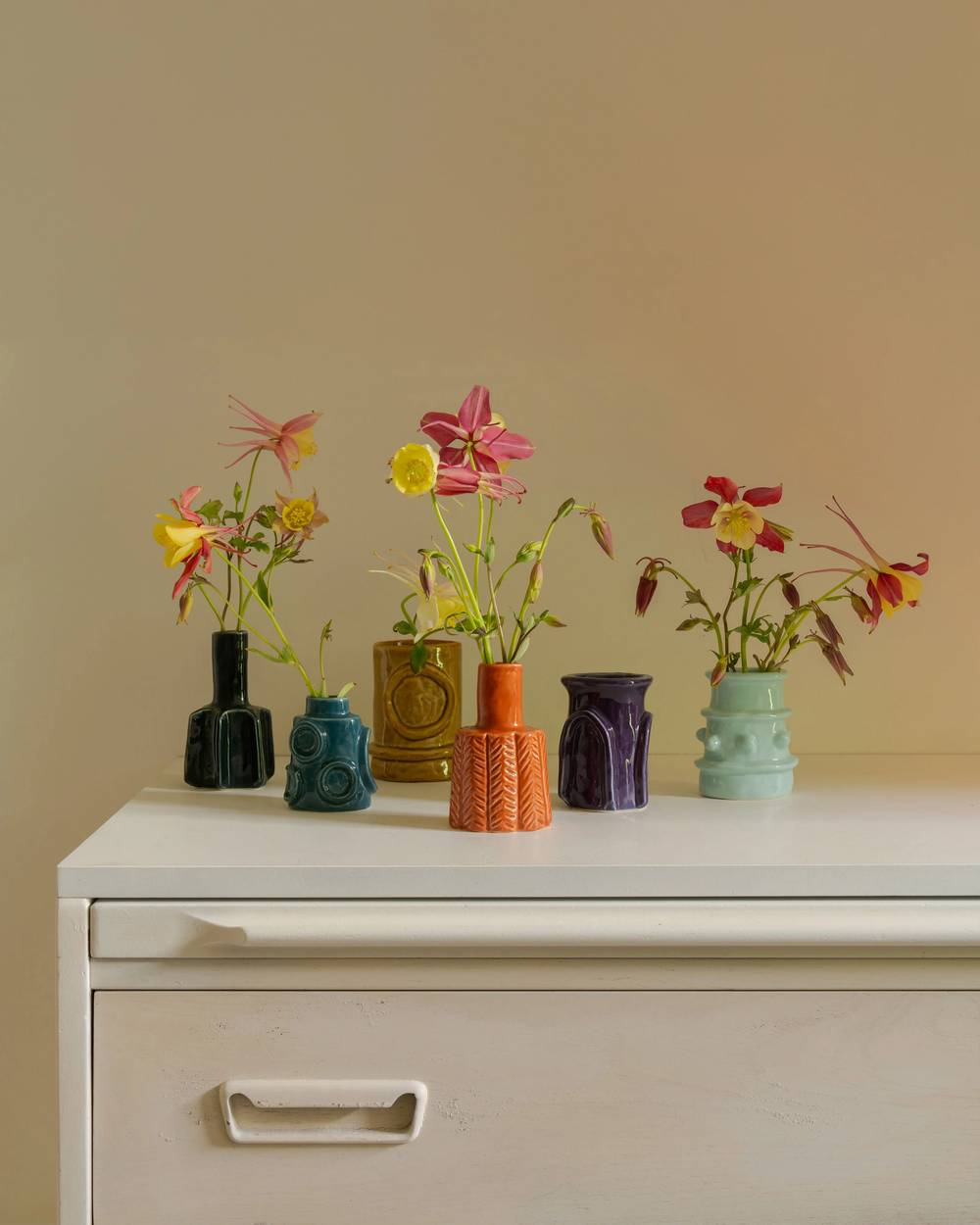 Cada jarra tem a sua própria forma, esmalte e detalhes, desde acabamentos texturizados a formas divertidas. Juntas, criam uma paisagem decorativa animada para flores soltas ou como detalhes expressivos por si só.