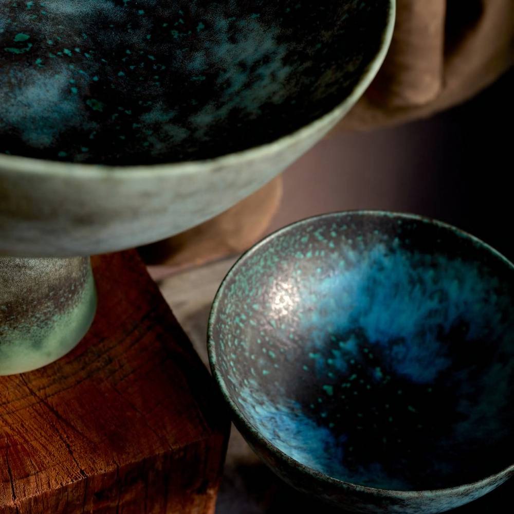 Uma icónica taça com pé num vidrado de bronze oxidado.