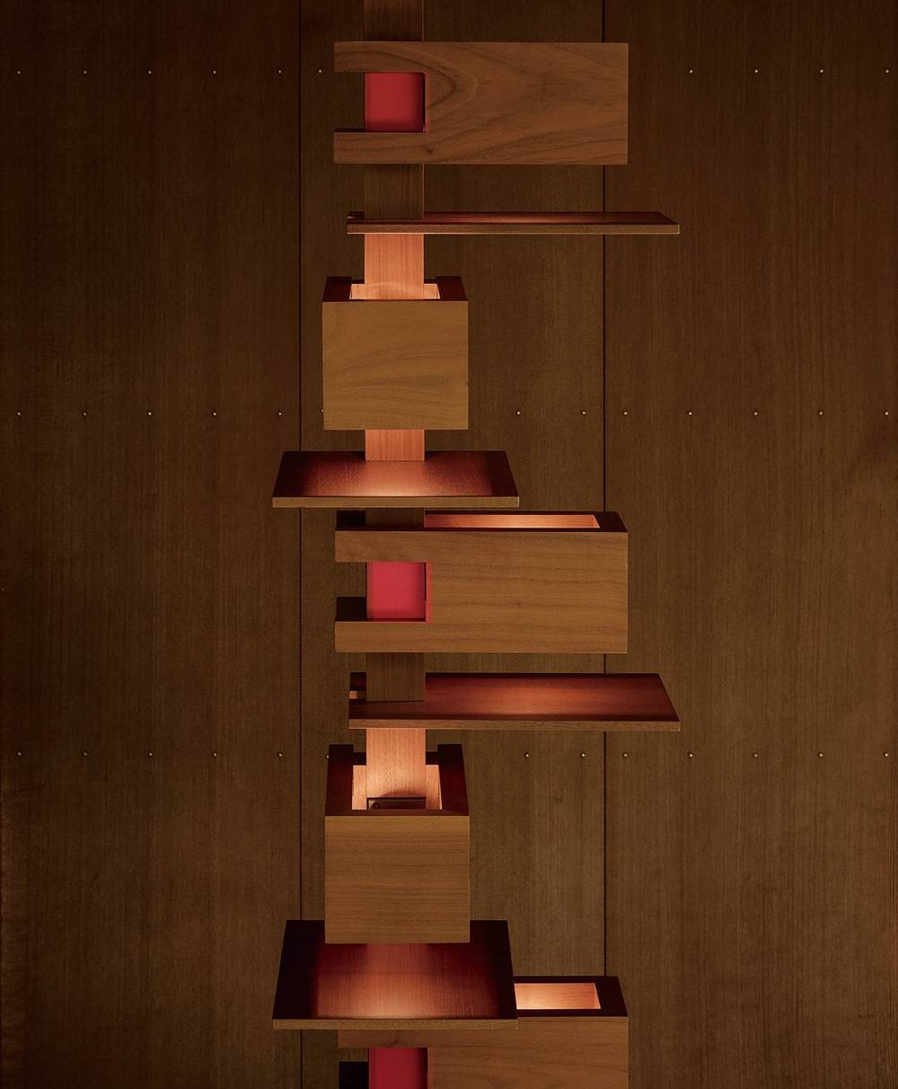 TALIESIN é composto por uma série de caixas rectangulares iluminadas de madeira maciça que funcionam como ramos e folhas para proporcionar uma composição escultural e orgânica a este candeeiro de pé. As caixas proporcionam uma iluminação indireta suave e padronizada, ocultando as fontes de luz e reduzindo o brilho. Estes candeeiros funcionam como uma decoração interior complementar, tanto durante o dia como à noite.