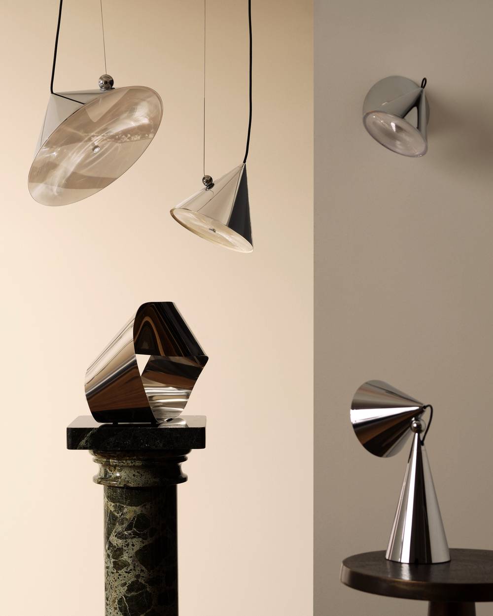 The POSE Task is a high output wall lamp based on conical forms that playfully explores the world of optical physics, through the world of flat lenses -often seen in lighthouses.