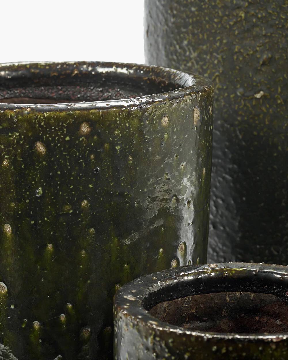 Kelly Wearstler's first venture into outdoor ceramics celebrates artisanal craftsmanship and natural glazing. The glazes are the soul of the collection. Their rich and dynamic surfaces transform throughout the day, catching and reflecting light in ways that make each piece feel alive and ever-changing.Marked by the artisan's refined touch and subtle variations that emerge from handcrafted processes, each piece stands as its own sculptural statement while inviting endless possibilities for combination in outdoor spaces.