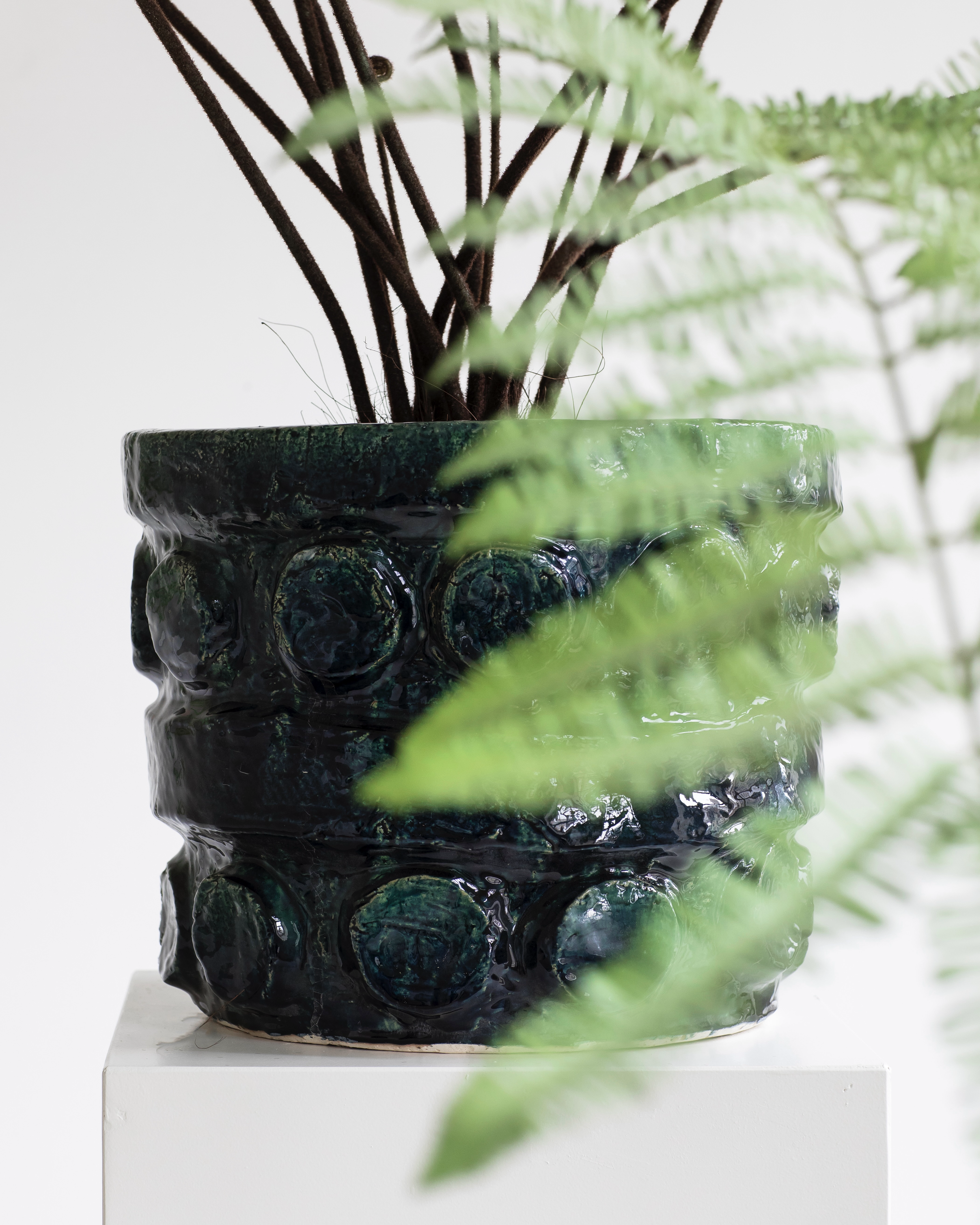 Portuguese artist Bela Silva was once again inspired by nature for Look At Me. ‘Particularly for the Look At Me pots, I was inspired by the energy and resilience plants radiate,’ she says. ‘Many people use flowers and plants as decoration, but they transcend this role. After all, flowers are clearly present. They breathe, move and love being the centre of attention. You could just keep looking at them, right? Hence the name of the collection: ‘Look at Me’. The blue-green glaze, a recurring feature in her work, combined with the crude, natural finish, creates a striking flowerpot. And yet, the pots are simple in their geometric design and repeated relief. Your plants have never looked better!