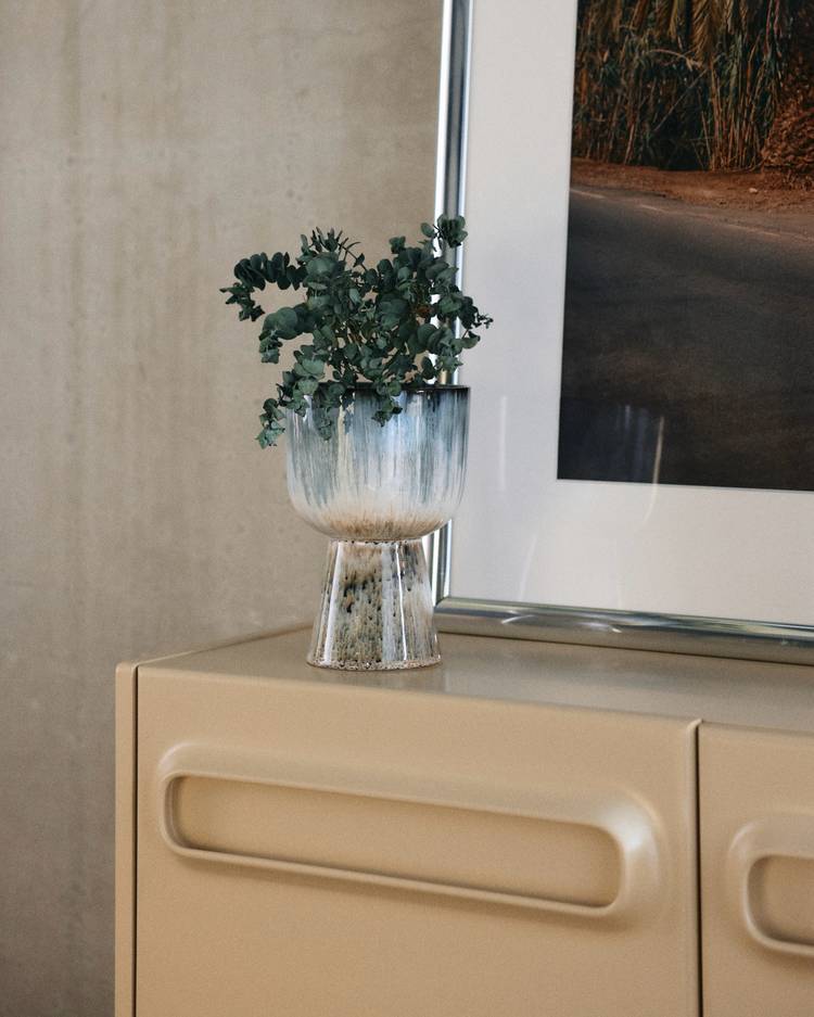 The reactive glaze adds depth and texture, ensuring every piece is one of a kind. Its light, airy design pairs beautifully with vibrant greenery, creating a striking contrast that elevates any interior.