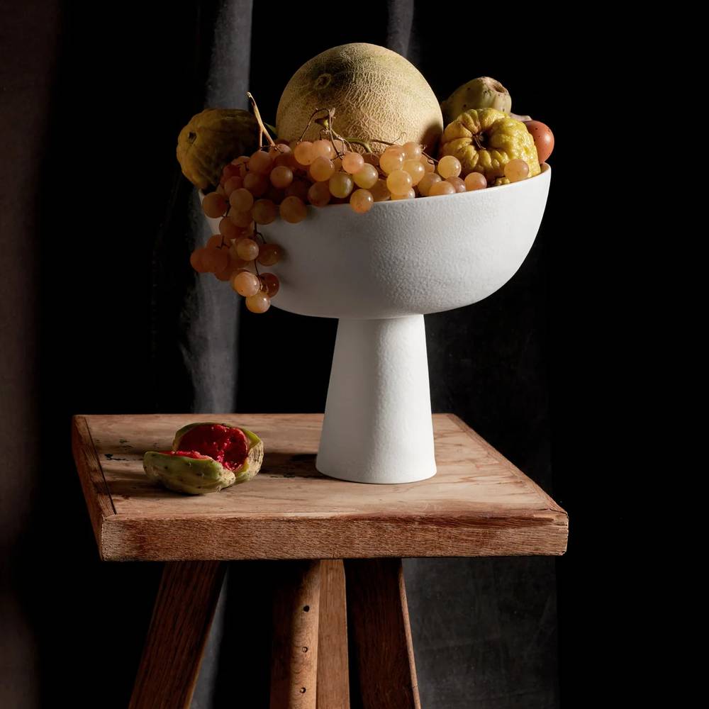 An iconic footed bowl in a weathered, mineral stone glaze.