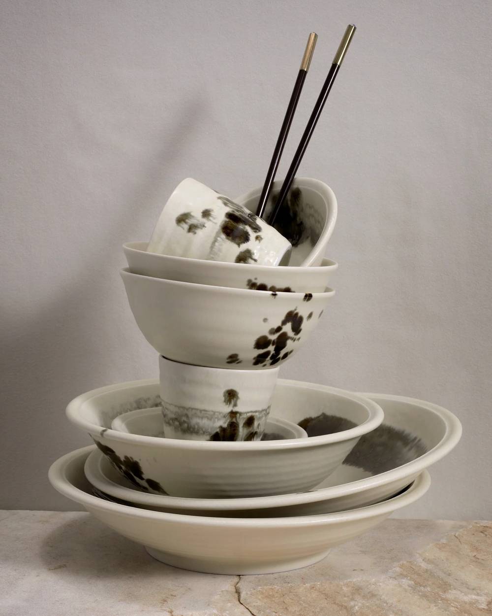 Hand-thrown Japanese porcelain, hand-painted with a traditional Sumi brush; a play on the conventions of Japanese design, each brush stroke of ink refers to the calligraphy’s symbol of eternity.