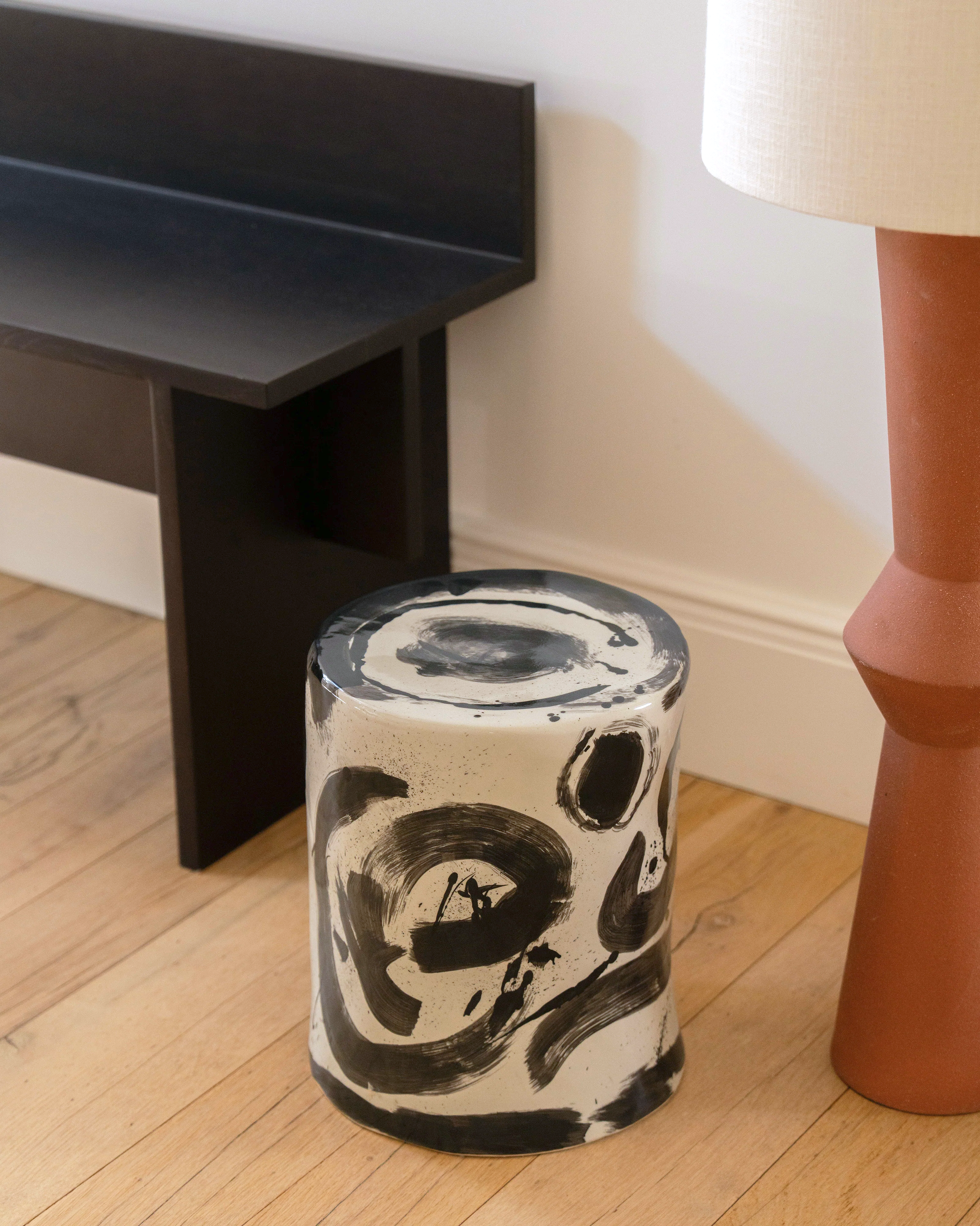 This handmade side table from the popular Pawn collection by Marie Michielssen has a distinctly artistic character. Its spontaneous shape and black brushstroke motifs reflect the designer’s creative freedom. A functional yet sculptural piece of designer furniture that stands out in any interior.