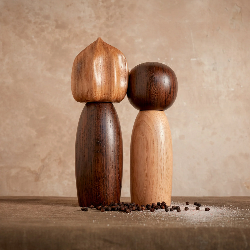 Hand carved in natural European oak and smoked oak, expertly outfitted with a high-quality metal grinding mechanism.