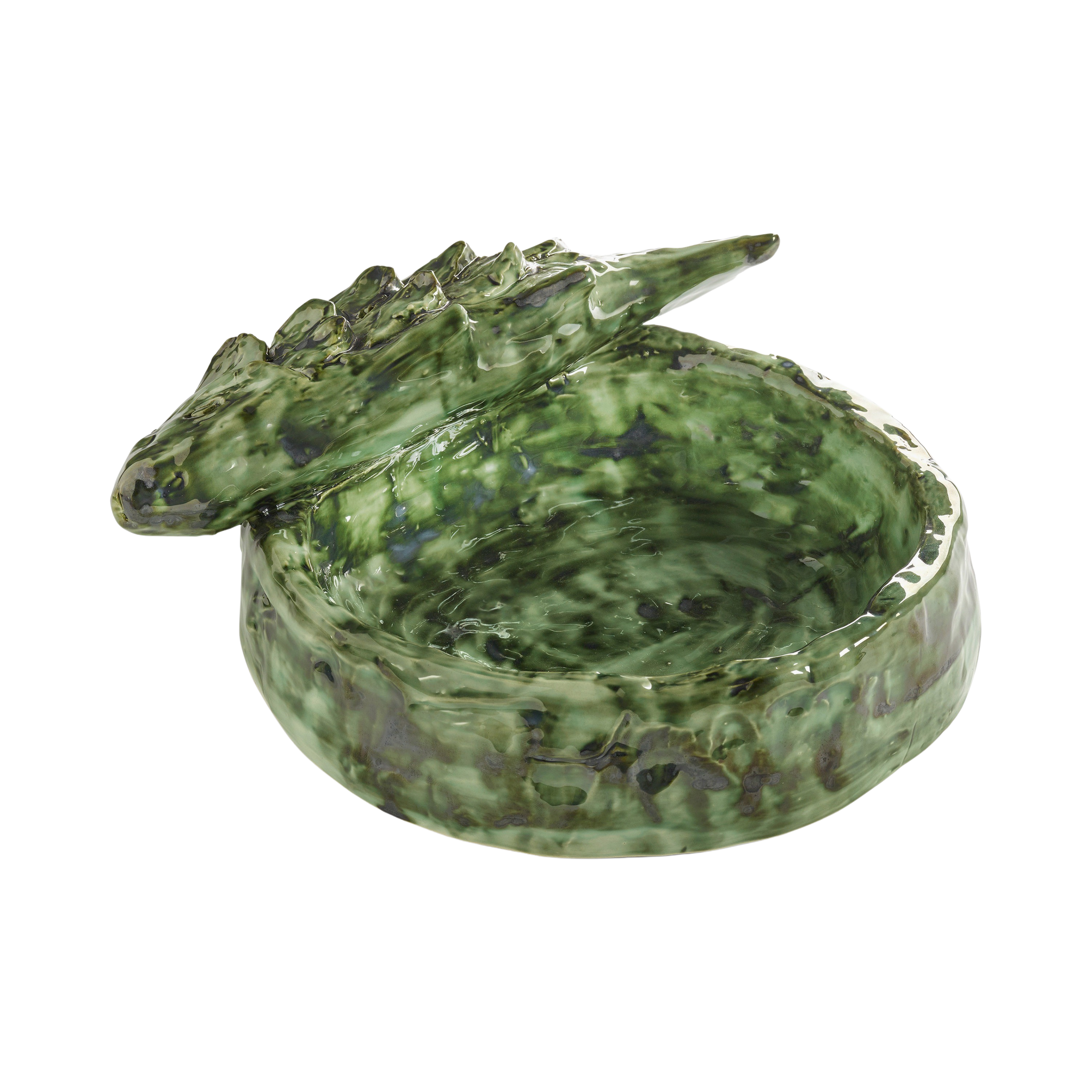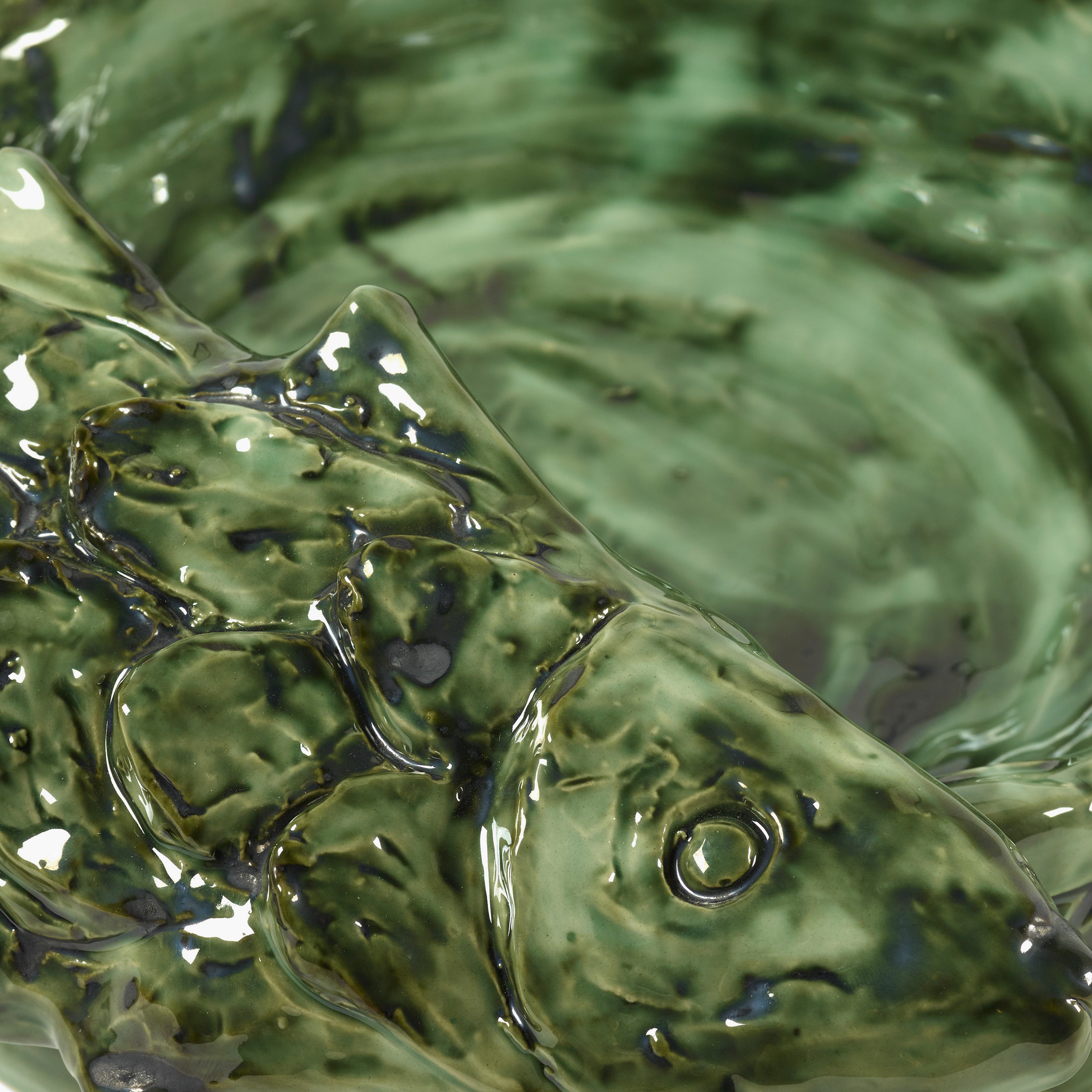The Cosas Lindas collection showcases Bela Silva’s work in more subdued tones, using soft green and beige glazes. Inspired by nature, the stoneware pieces are richly adorned with carved fish and birds.