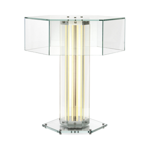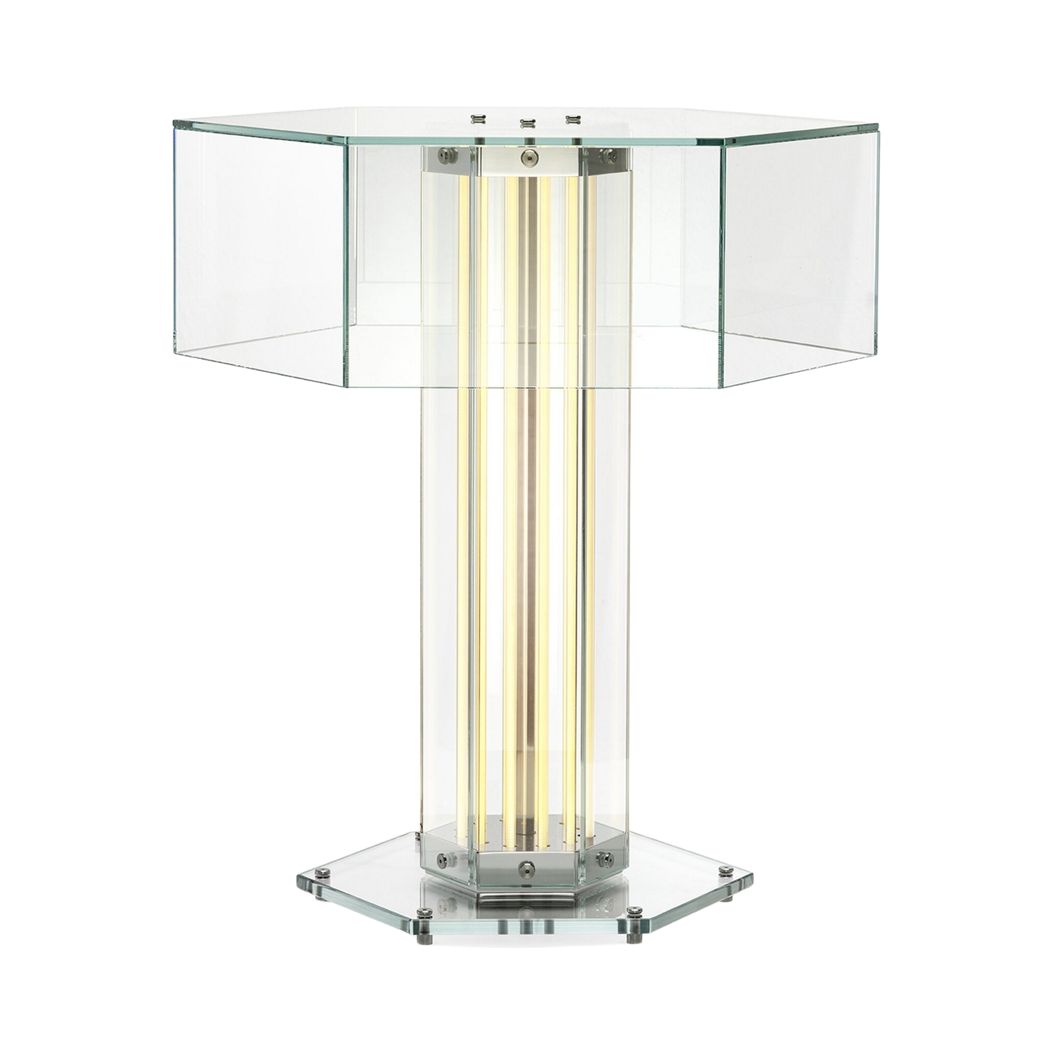 Made up of one or more hexagons of planar glass connected by a polished aluminum element, SuperWire lights up its entire surface thanks to a new source: a very thin, flat, soft, flexible LED strip measuring up to one meter, which emits a warm and homogeneous light along its entire length and which can be easily removed for replacement and repair, unique in the panorama of LED bulb-less lamps.This table version, consists of a single module H.45 cm, surmounted by a hexagonal glass cover.