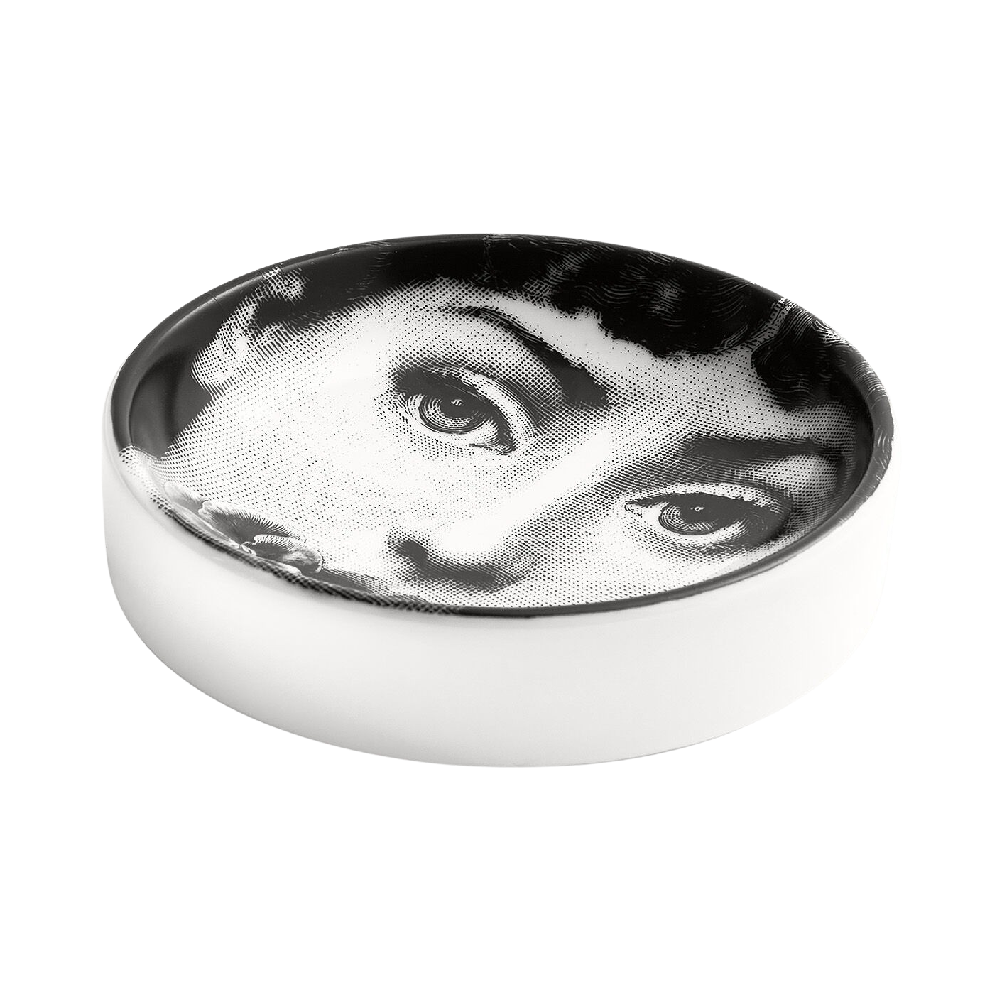 The face of opera singer Lina Cavalieri, reinterpreted by Piero Fornasetti, embellishes this hand-decorated porcelain ashtray, part of the iconic Tema e Variazioni series: an everyday object thus becomes a true collector's item.