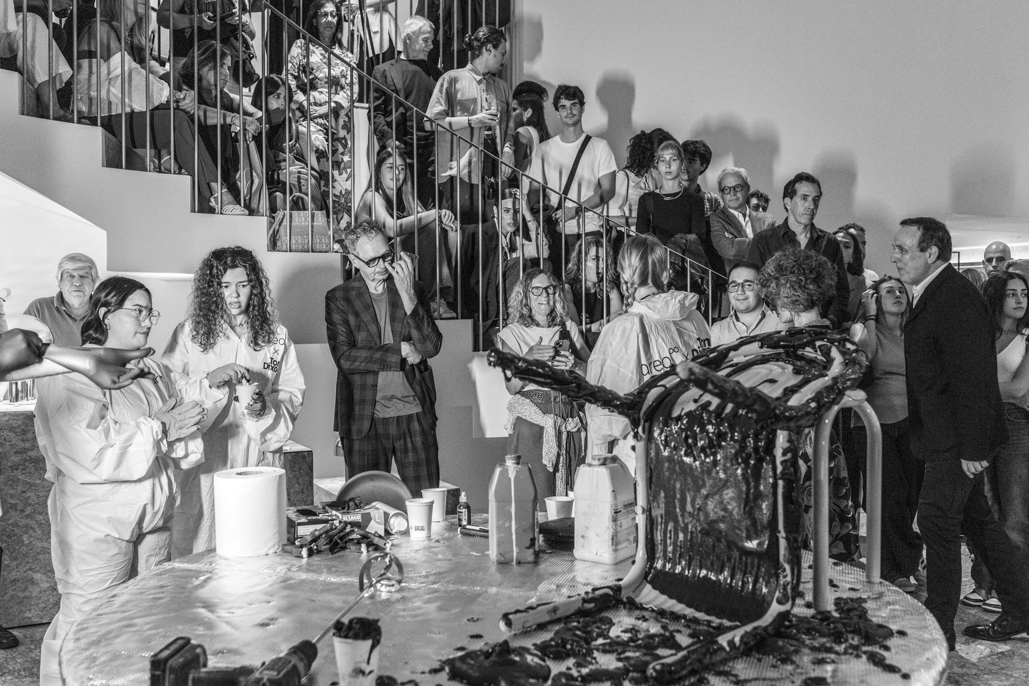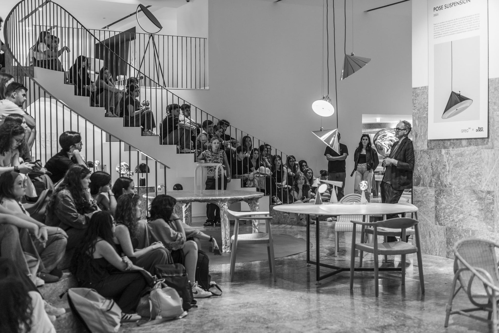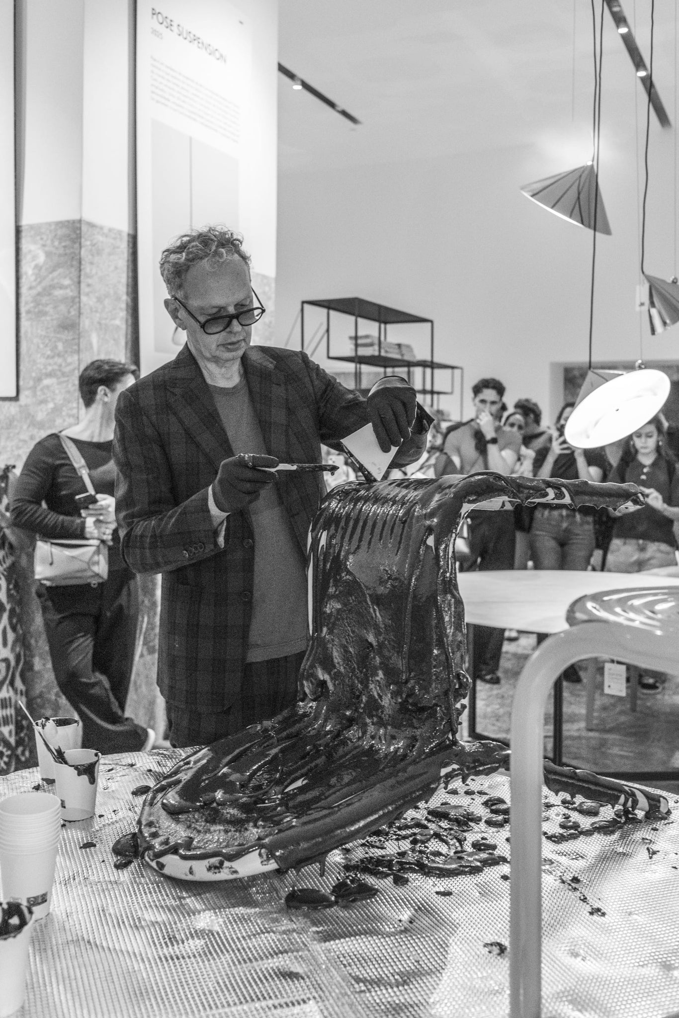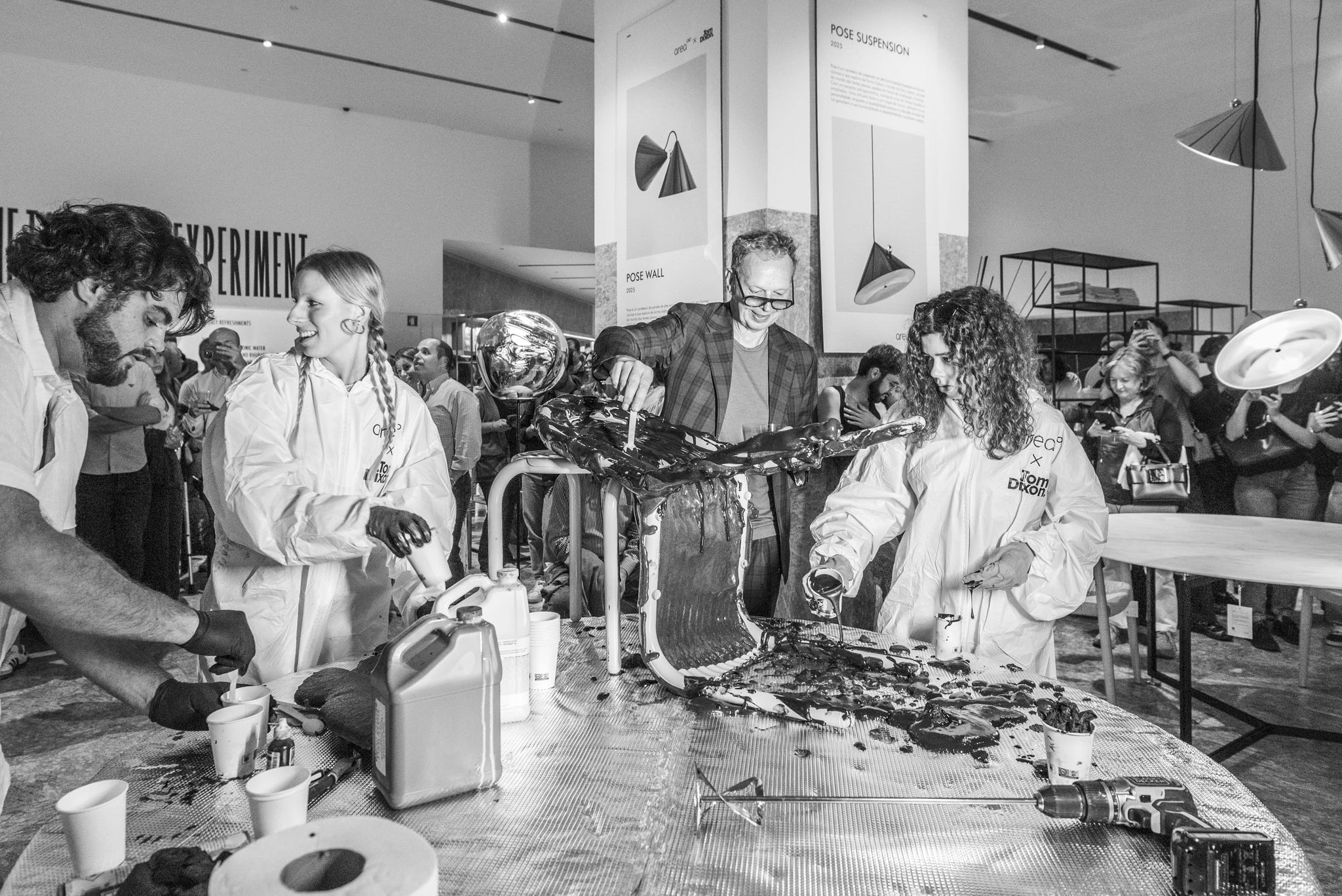 Em mais uma colaboração inédita com o aclamado designer britânico, a Area apresentou na sua loja do Norteshopping, no Porto, The Tom Dixon Experiment, uma demonstração de criatividade em tempo real, na qual Tom Dixon reinterpretou a sua cadeira Groove num exercício de experimentação formal e material. Antes da sessão ao vivo, Tom conversou sobre o seu percurso e processo criativo com alunos da Escola Superior de Arte e Design que puderam acompanhar e assistir à concepção e execução do protótipo que se seguiu. Partindo da sua cadeira Groove como base, o designer explorou a aplicação de um polímero negro que, vulcanizando em contacto com o ar, transformou a peça original numa nova forma, densa e expressiva. O processo, simultaneamente técnico e performativo, revelou a curiosidade incessante de Tom e a sua capacidade de reinventar materiais num processo de experimentação permanente. O resultado foi uma peça singular — síntese entre matéria, processo e intuição — que reafirma o carácter visionário de Tom Dixon e a sua cumplicidade criativa com a Area.