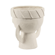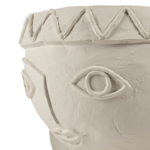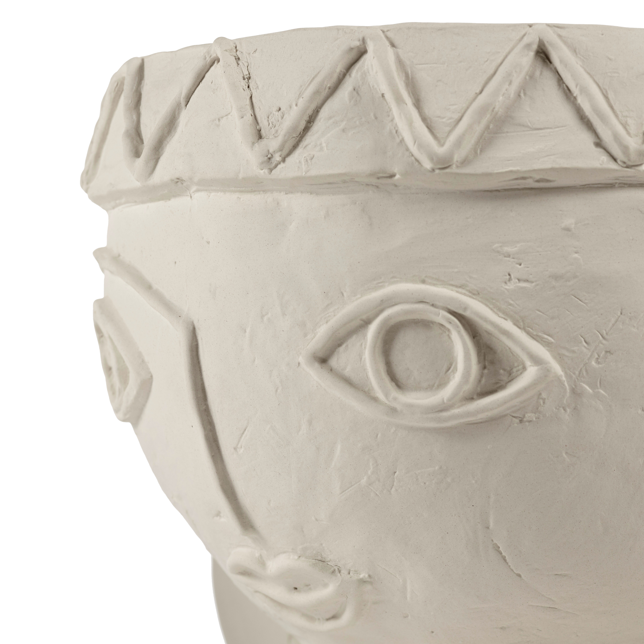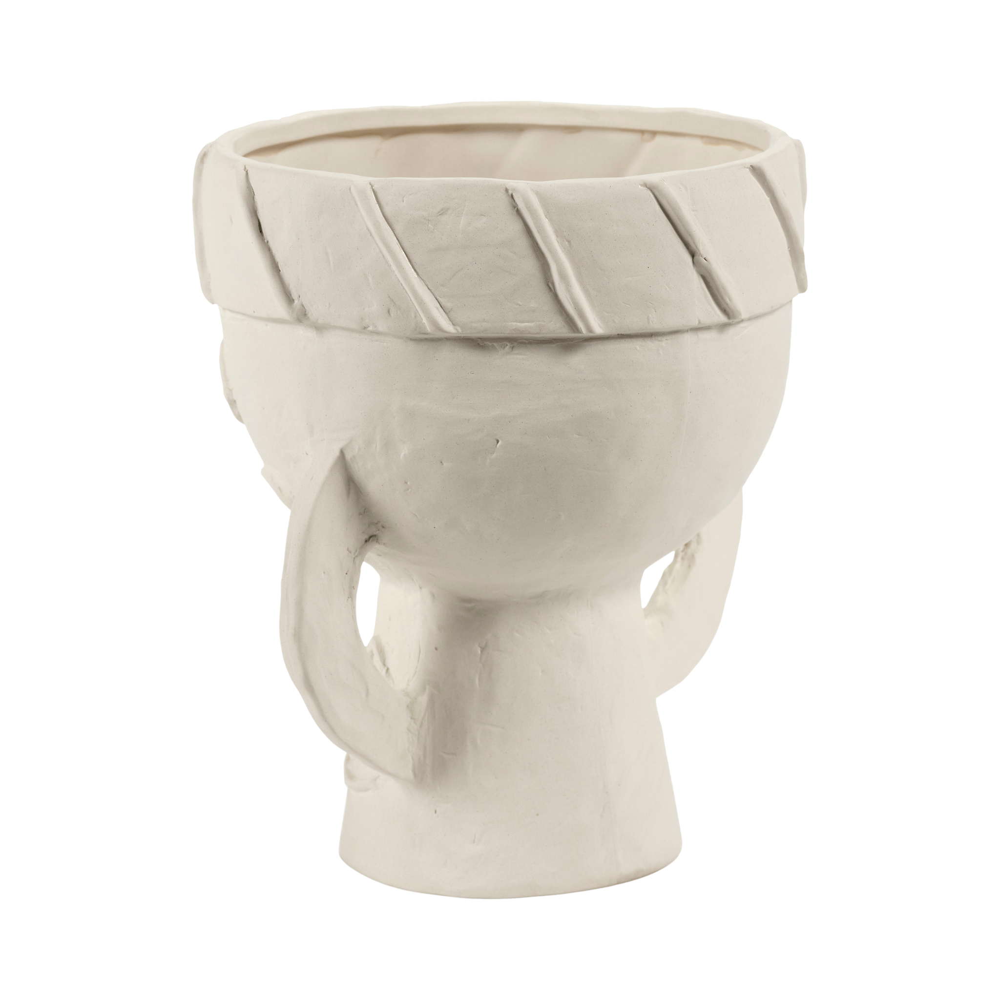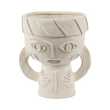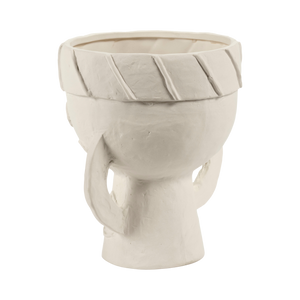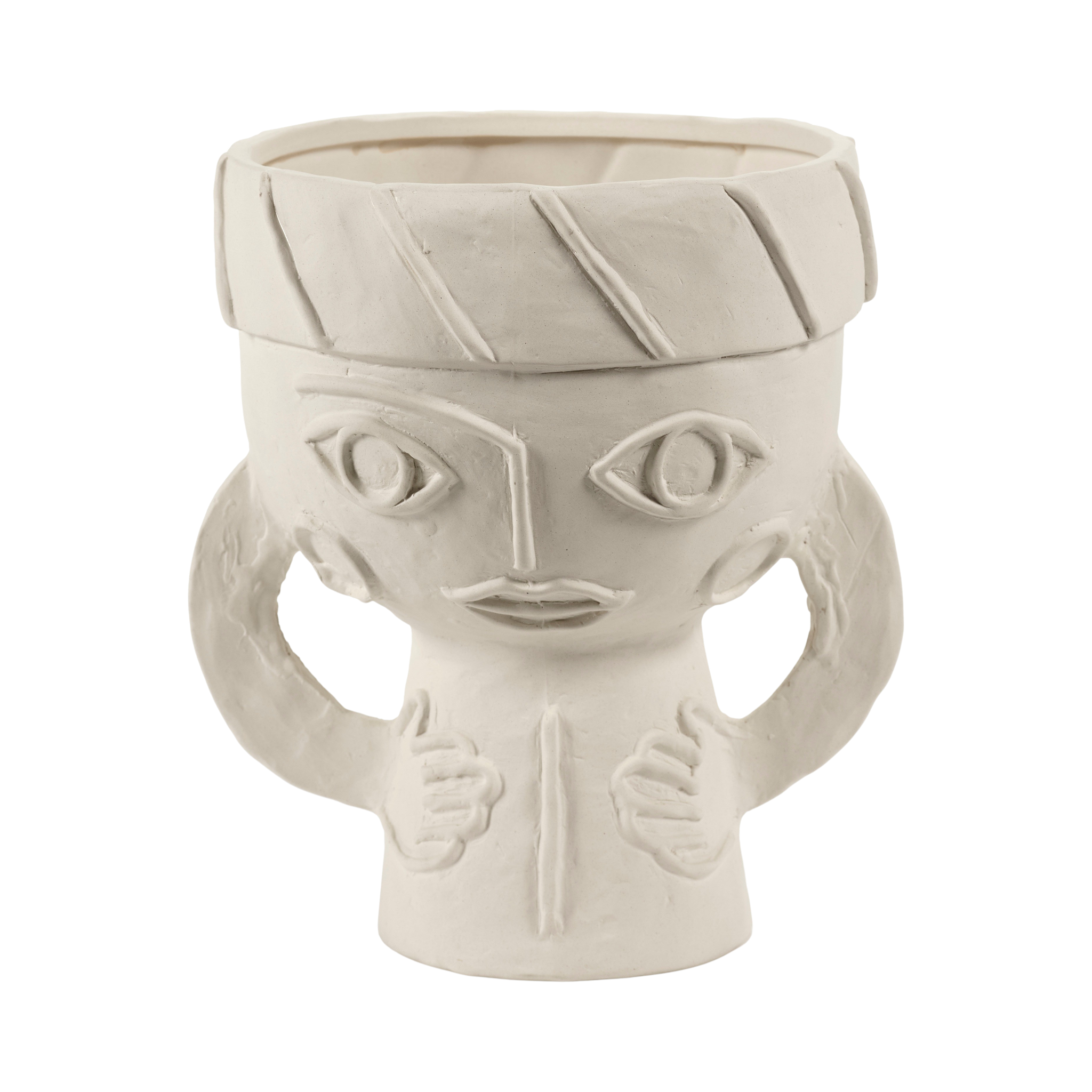 Todos os pormenores dos toucados foram trabalhados com requinte, contrastando com a natureza mais áspera do barro chamote. Um subtil esmalte mate transparente reveste cuidadosamente o interior e o fundo das jarras.