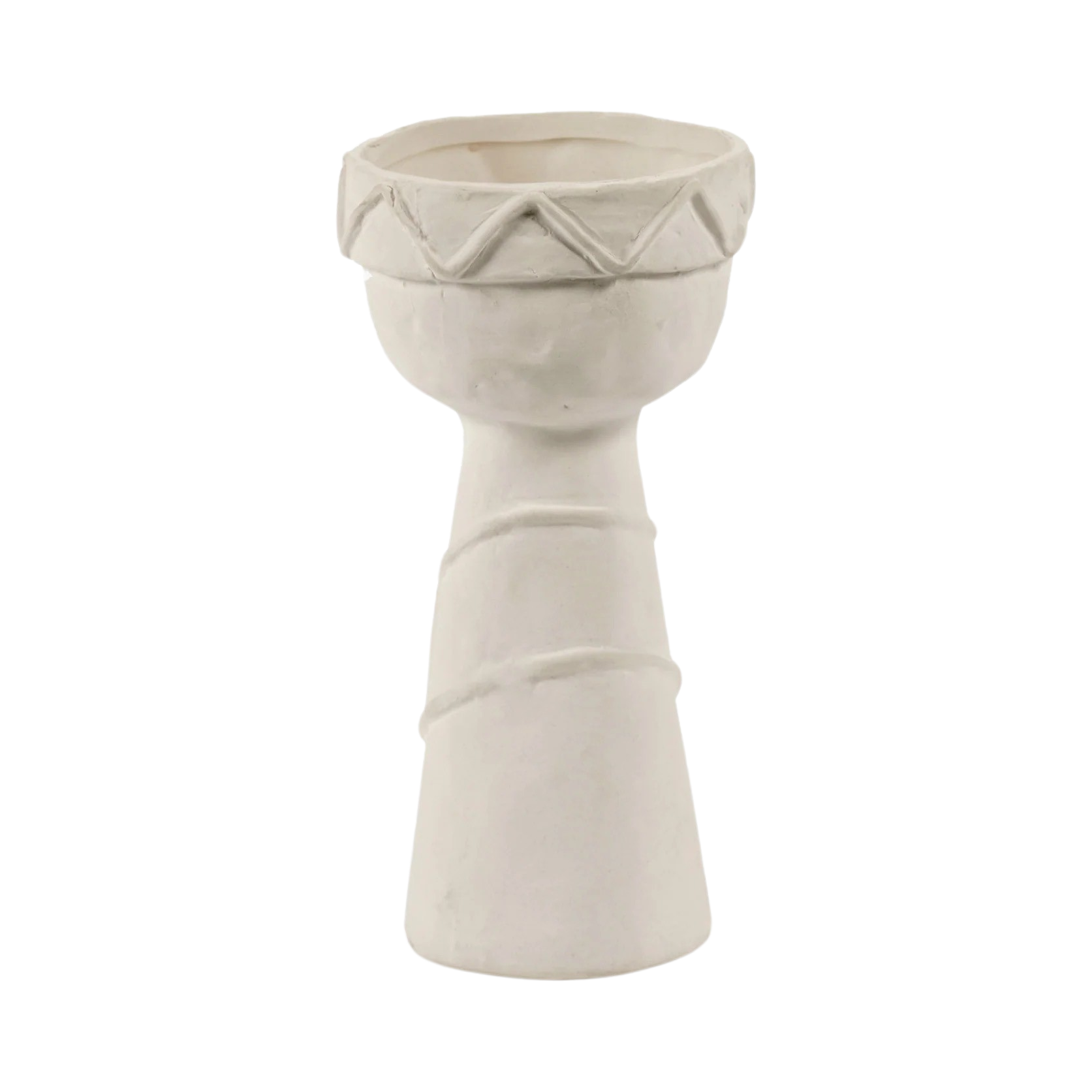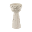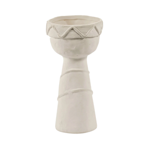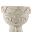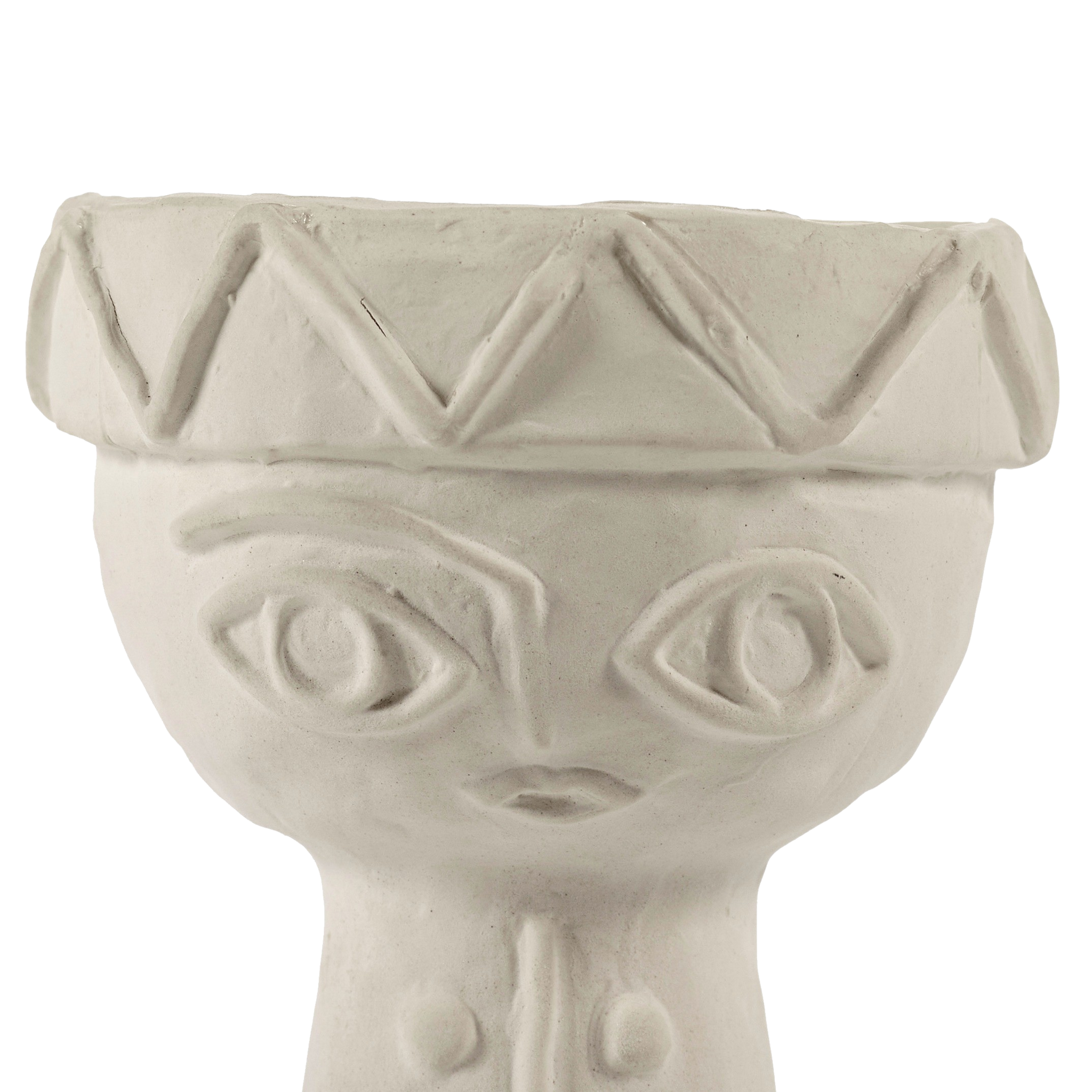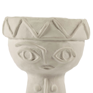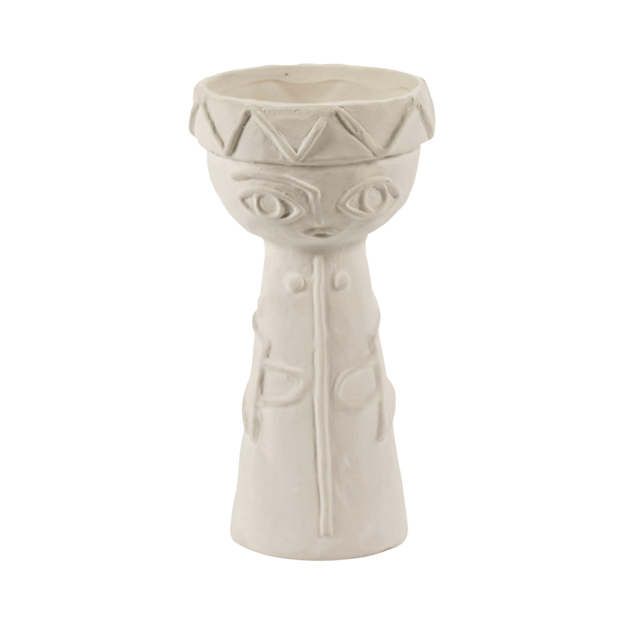 Todos os pormenores dos toucados foram trabalhados com requinte, contrastando com a natureza mais áspera do barro chamote. Um subtil esmalte mate transparente reveste cuidadosamente o interior e o fundo das jarras.